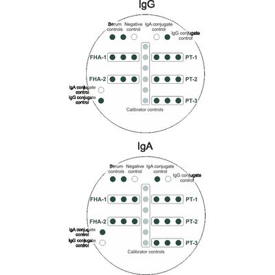 The Bordetella pertussis ViraChip IgG and IgA are protein microarrays for the quantitative detection of IgG and IgA antibodies against Bordetella species antigens in human serum. As a miniaturized immunoblots based on an enzyme immunoassay, the Bordetella pertussis ViraChip® IgG and IgA use purified specific native antigens: Filamentous Hemagglutinin (FHA) and Pertussis Toxin (PT). To quantify antigen titers via the ViraChip® software, the FHA and the PT antigen triplets are applied in two, respectively in three different concentrations, intended to differentiate between a recent contact with Bordetella pertussis and a past infection. The Bordetella pertussis ViraChip® IgG and IgA Test Kits are composed of 96 single breakable wells each placed in a standard microtiter plate. The test procedure can be performed with common ELISA processors. The ViraChip® Software controls the entire process including the analysis of the test results.