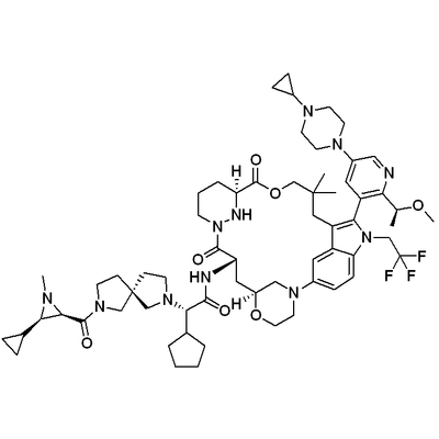 - Smiles: C(C(F)(F)F)N1C(=C2C=3C1=CC=C(C3)N4C[C@](C[C@H](NC([C@@H](N5C[C@@]6(CC5)CN(C(=O)[C@H]7[C@H](N7C)[C@@H]8CC8)CC6)[C@H]9CCCC9)=O)C(=O)N%10N[C@](C(=O)OCC(C)(C)C2)(CCC%10)[H])(OCC4)[H])C%11=C([C@@H](OC)C)N=CC(=C%11)N%12CCN(CC%12)C%13CC%13