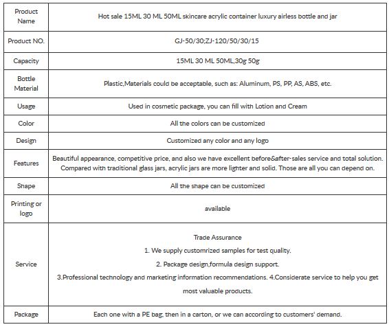 Surface Handling:Screen Printing. Base Material:acrylic. Body Material:acrylic. Collar Material:acrylic. Sealing Type:PUMP SPRAYER. Plastic Type:Acrylic. Use:Skin Care Cream. Material:Plastic. Color:all color will be customized. MOQ:3000pcs. Mold:Customizable. Surpface Handing:Screen Printing. Name:airless bottle cosmetic container luxury bottle luxury bottle. Industrial Use:cosmetic plastics.