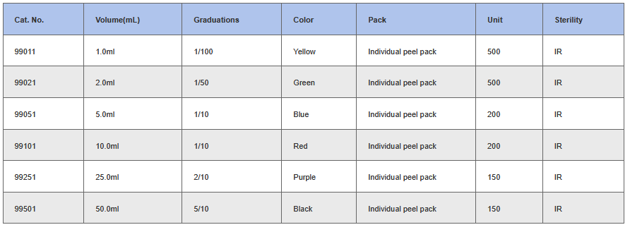 Manufactured from virgin polystyrene are ideal for accurate liquid transfer or mix. Management system EN ISO13485 with SOPs and 100,000 grade clean-room guarantee quality. Available with 6 capacity of 1.0, 2.0, 5.0, 10.0 , 25.0 and 50.0ml The 1ml, 2ml and 5ml are a one piece construction and the 10ml, 25ml and 50ml pipets are made with a durable ultrasonically welded 3 piece construction. Clear black printing guarantee maximum an accuracy of ±2%.
